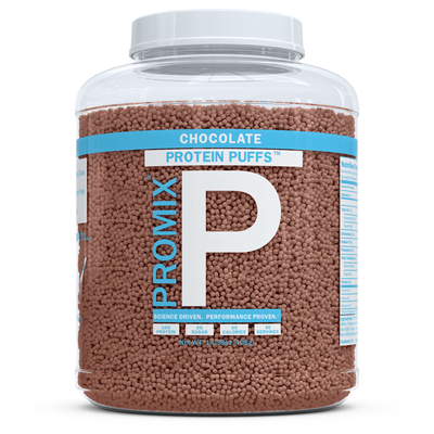 Ingredients: PROMIX Chocolate Protein PuffTM (Whey Protein Isolate, Whey Protein Concentrate, Non-GMO Tapioca, Cocoa, Calcium, Less than 1% Non-GMO Sunflower Lecithin)